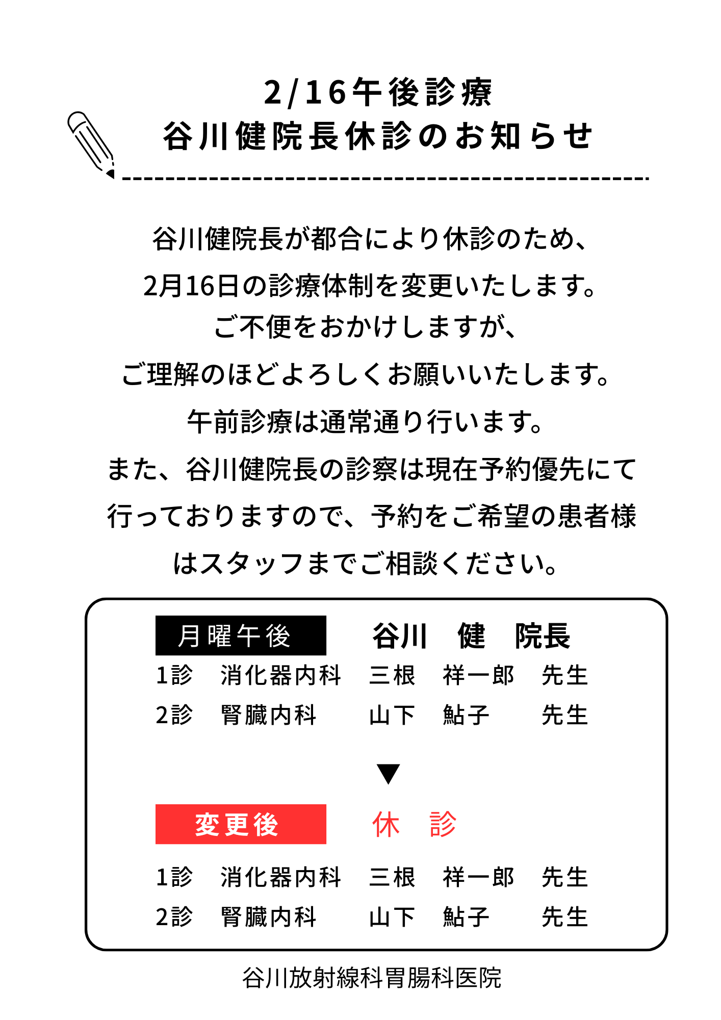 谷川放射線科胃腸科医院より、2月9日と10日の腎臓内科における担当医変更をご案内します。当初の予定から担当日が入れ替わります。