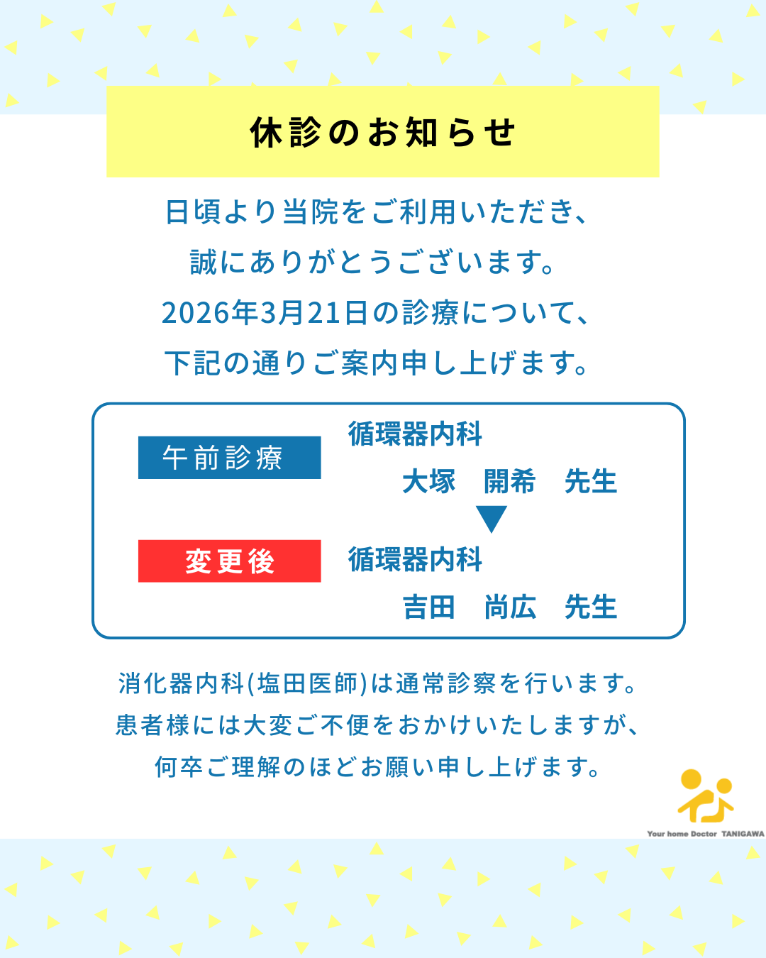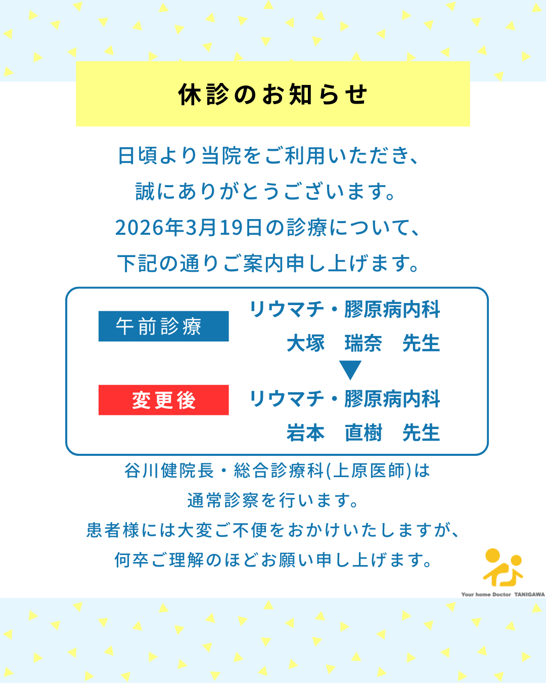 いつも当院をご利用いただき、誠にありがとうございます。 2026年3月19日(木)午前の診療において、担当医の変更がございます。