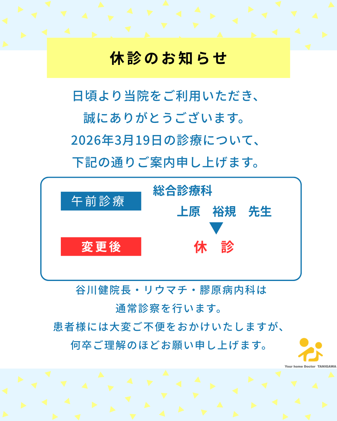 いつも当院をご利用いただきありがとうございます。 明日、3月19日(木)午前の診療について、急遽変更がございます。