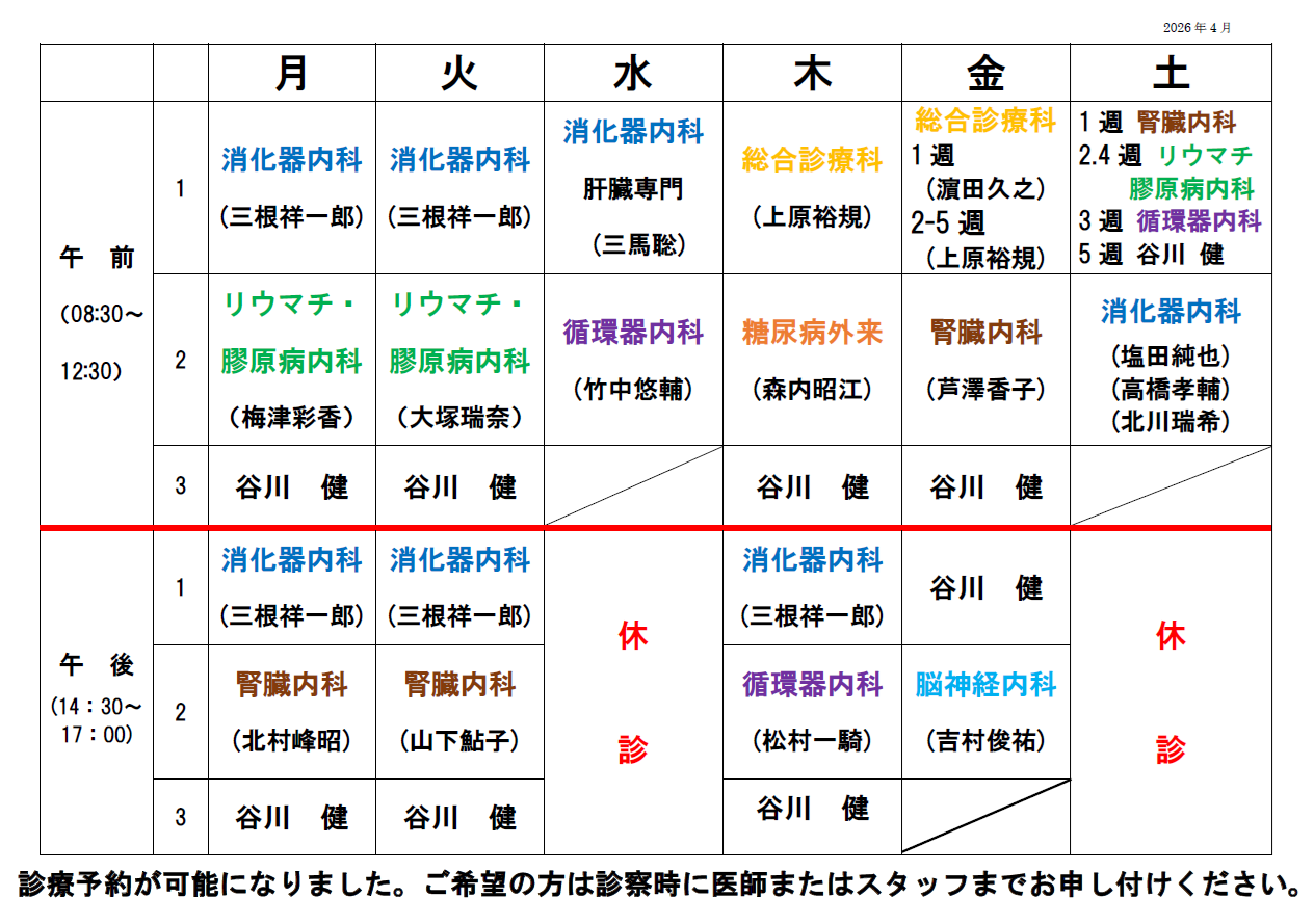 2026年4月より、以下の通り診療曜日が変更となります。