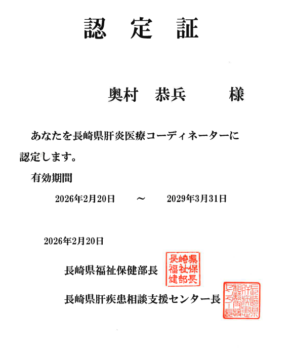 この度、当院の医事課スタッフである奥村が、新たに「長崎県肝炎医療コーディネーター」の認定を受けました 。