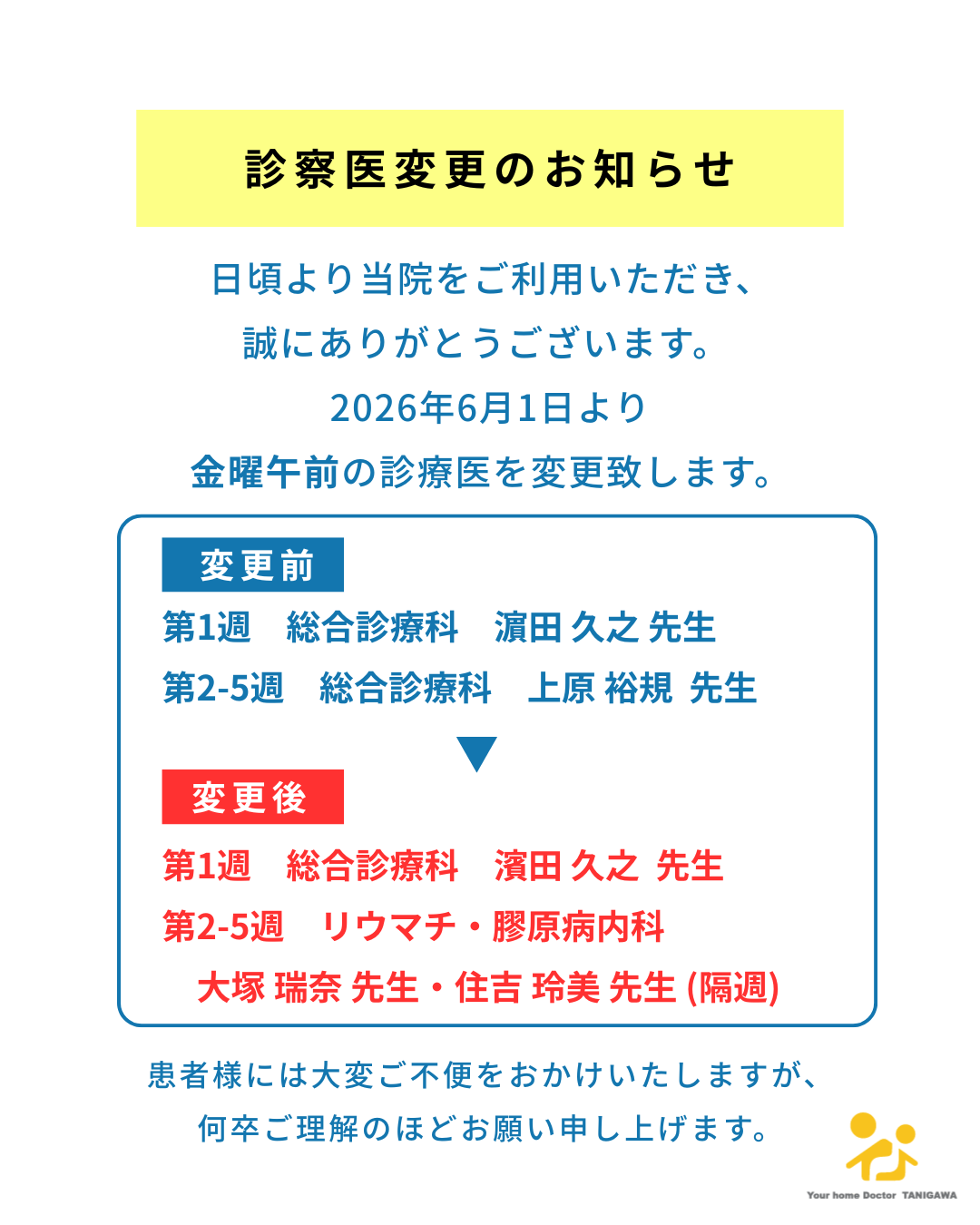 当院では、2026年6月1日より金曜午前の診察医を以下の通り変更させていただきます。