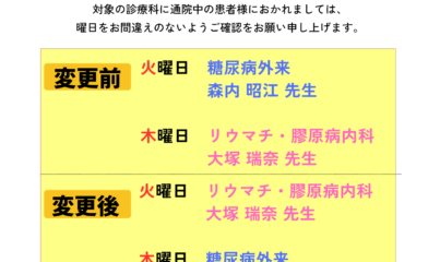 お知らせ【重要】2026年4月より 外来診療科曜日変更のお知らせ